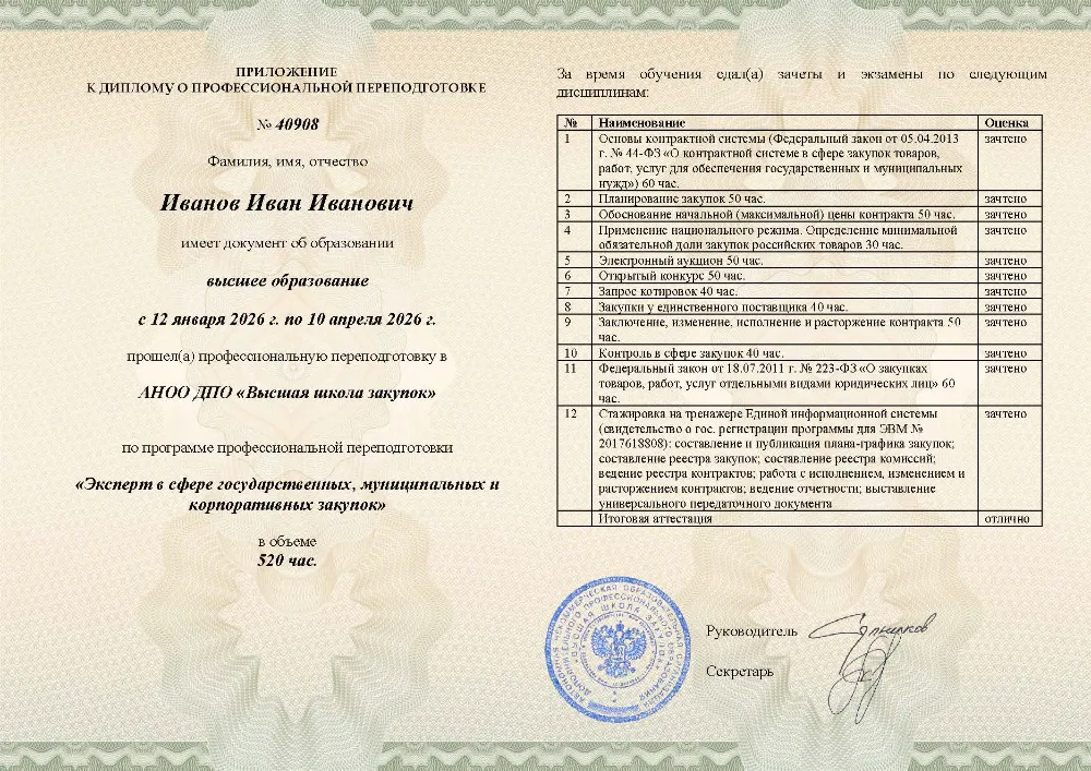 Вы получаете диплом эксперта о профессиональной переподготовке. Высшая школа закупок (fz44.org) в обязательном порядке вносит сведения об обучении в Ижевске в реестр Рособрнадзора, подтверждая вашу квалификацию для работы в ведомствах и госкорпорациях Ижевска.